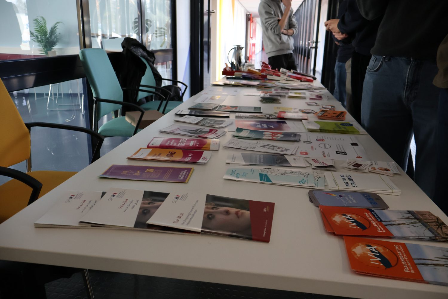 Der Stand vor der Cafeteria wurde klassenweise und mit Voranmeldung von den Schülerinnen, Schülern und der unterrichtenden Lehrkraft besucht. Zwölf Vollzeit- und Berufsschulklassen haben sich für den Kurzvortrag und das Mitnehmen von Informationsmaterial angemeldet. Wir konnten auf diesem Wege circa 240 (+/-) Schülerinnen, Schüler und Lehrkräfte mit interessanten Informationen und zur Sensibilisierung für das Thema „Gewalt gegen Frauen“ erreichen.